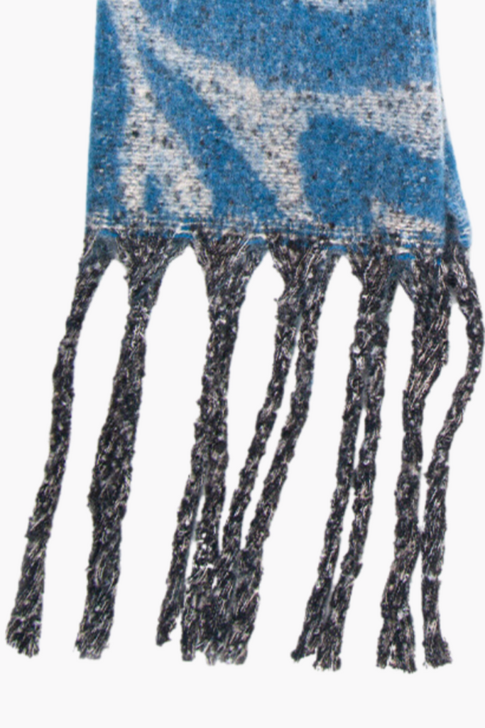 Keep cosy all season long with our blue heavyweight zebra print scarf, featuring a tasseled edge.