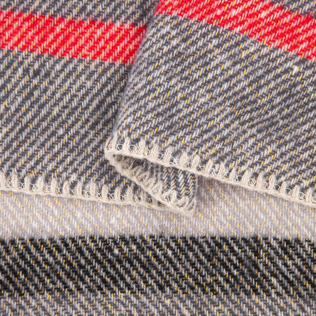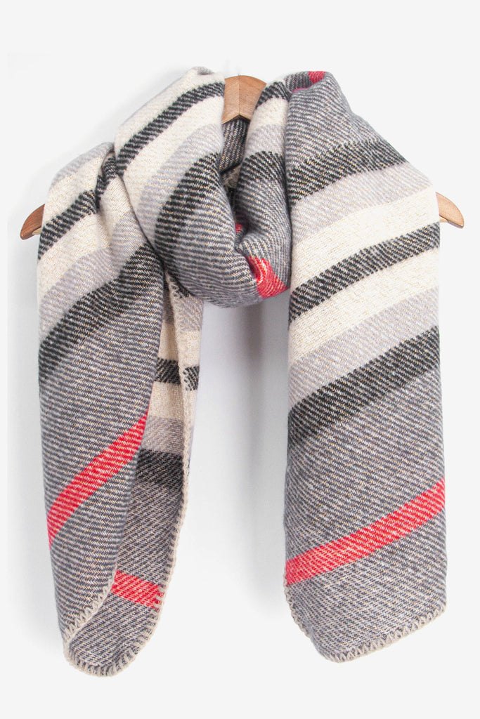 An oversized winter scarf crafted from soft to the touch viscose. A grey scarf showcasing contrasting pink and cream stripes and an artisan influenced stitched trim. Designed for warmth, this scarf can be effortlessly paired with outdoor winter attire