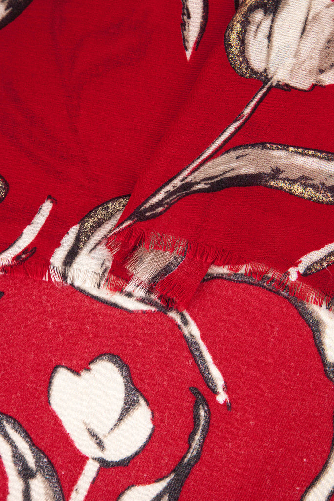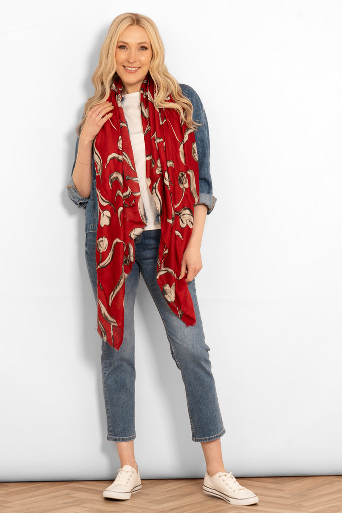 A lightweight autumnal scarf crafted from a soft viscose yarn. Showcasing bold floral design in contrasting red and cream hues with gold glitter accents. A versatile, transitional piece, this design can be worn as a scarf or evening wrap.
