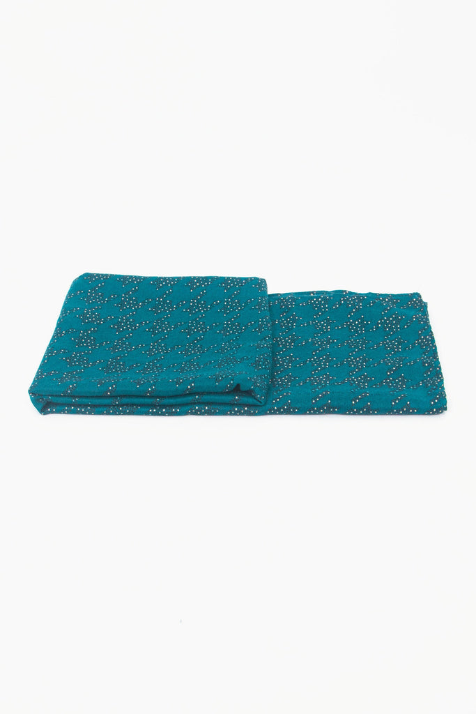 A lightweight textured scarf crafted from a soft viscose yarn. Showcasing a houndstooth pattern and subtle foil accents. A versatile transitional piece, this design can be worn as a scarf or evening wrap.