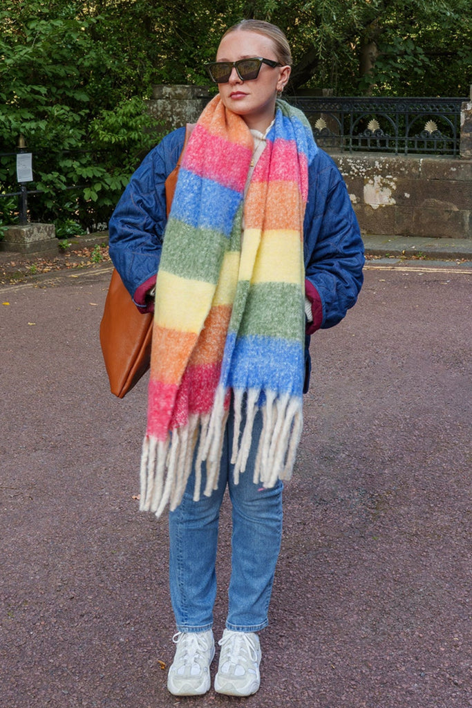 An oversized winter scarf crafted from soft to the touch viscose. Showcasing a horizontal rainbow stripe design in and a bohemian influenced tasselled fringe. Effortlessly pair with outdoor winter attire.