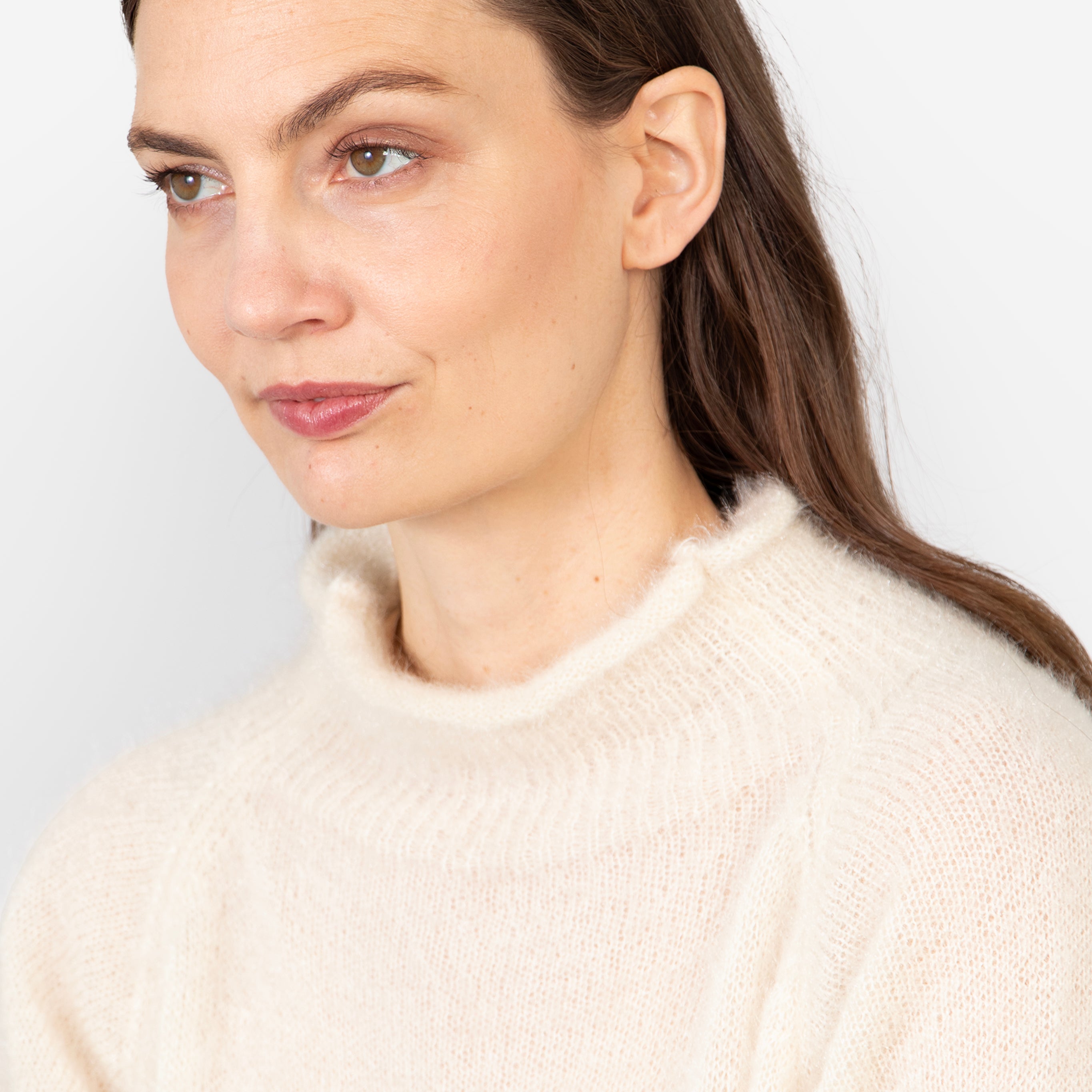 A classic cream box jumper crafted from a wool blend yard. Showcasing a mohair texture, high neck and cropped bell sleeves this winter jumper is designed to feel cosy.