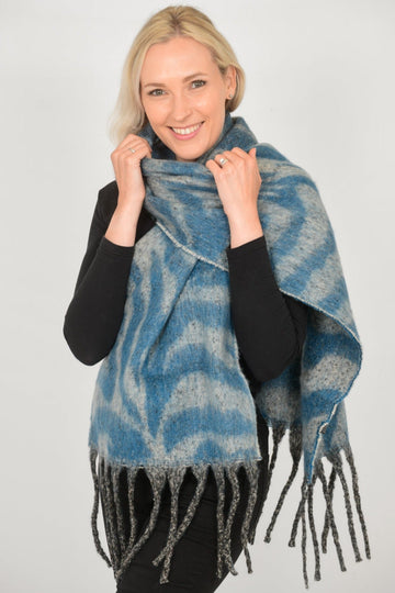 Keep cosy all season long with our blue heavyweight zebra print scarf, featuring a tasseled edge.
