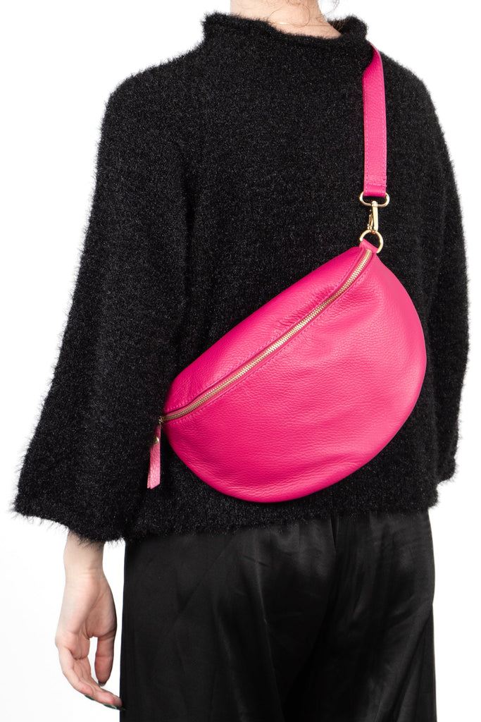This fuchsia half moon bag is crafted from genuine Italian leather. Featuring a lined interior, zip closure and classic gold hardware. This luxurious half-moon bag includes a removable adjustable strap to wear over the shoulder or carry cross-body.