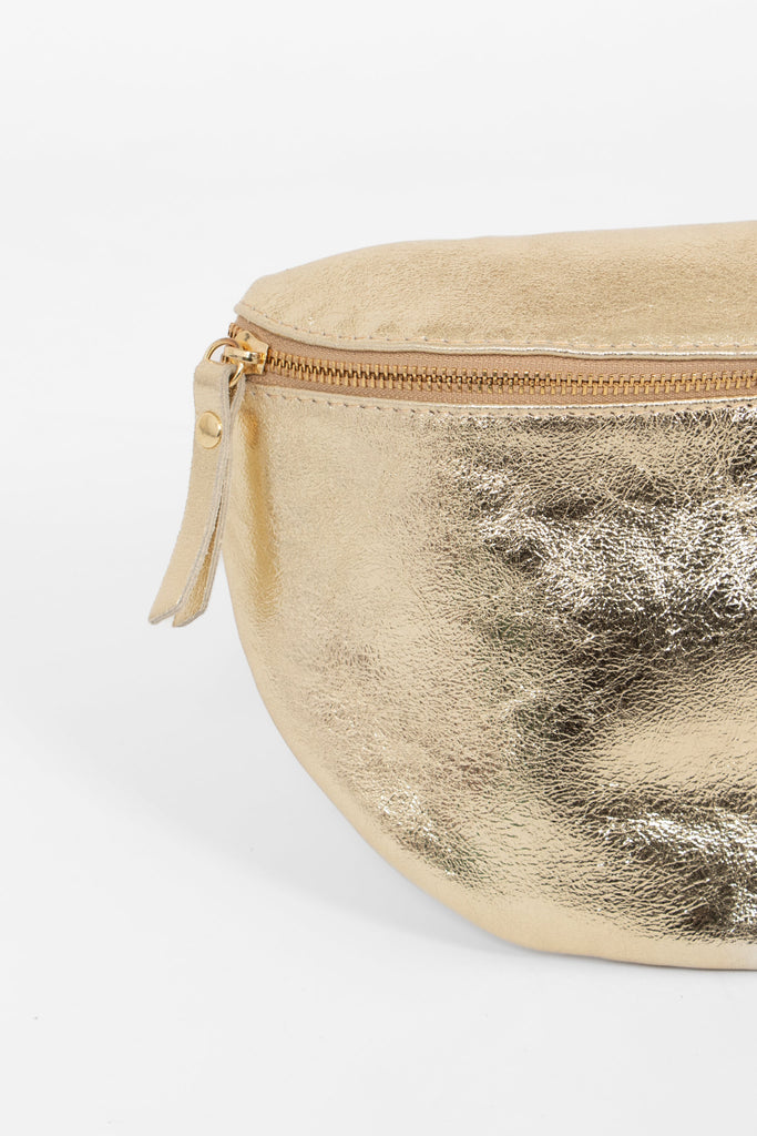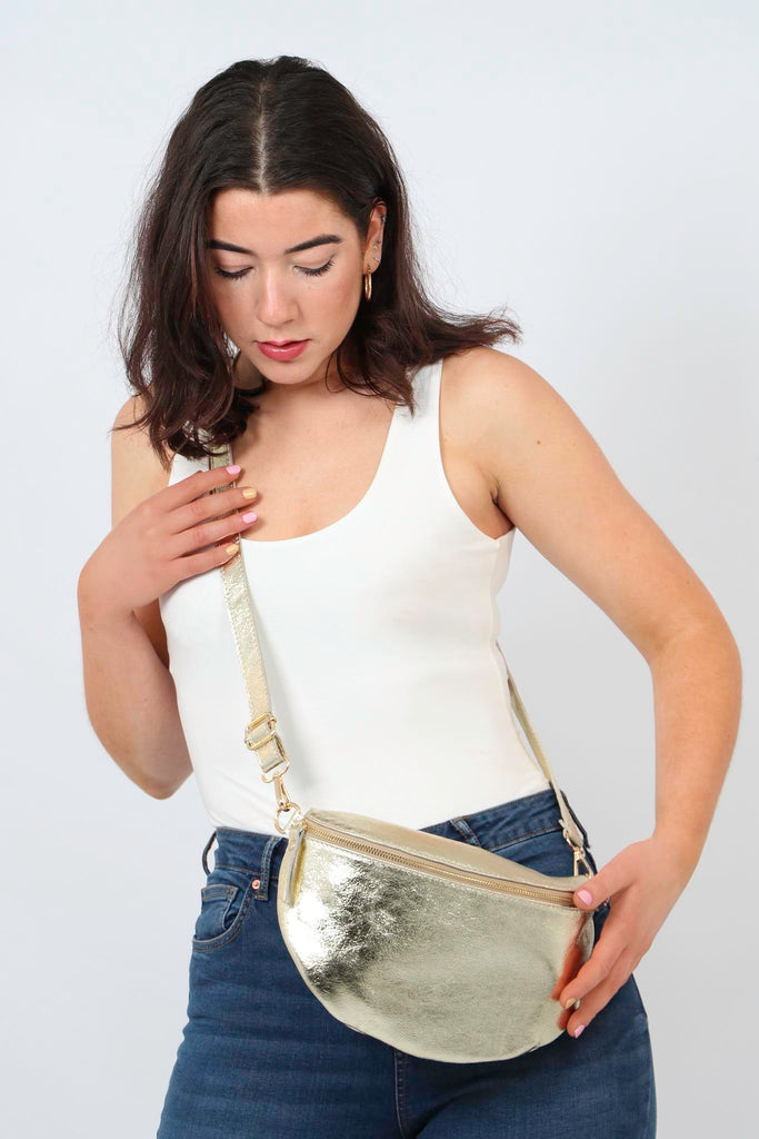 This metallic gold half-moon bag is crafted from genuine Italian leather. Featuring a lined interior, zip closure and classic gold hardware. This luxurious half-moon bag includes a removable adjustable strap to wear it over the shoulder or carry cross-body.