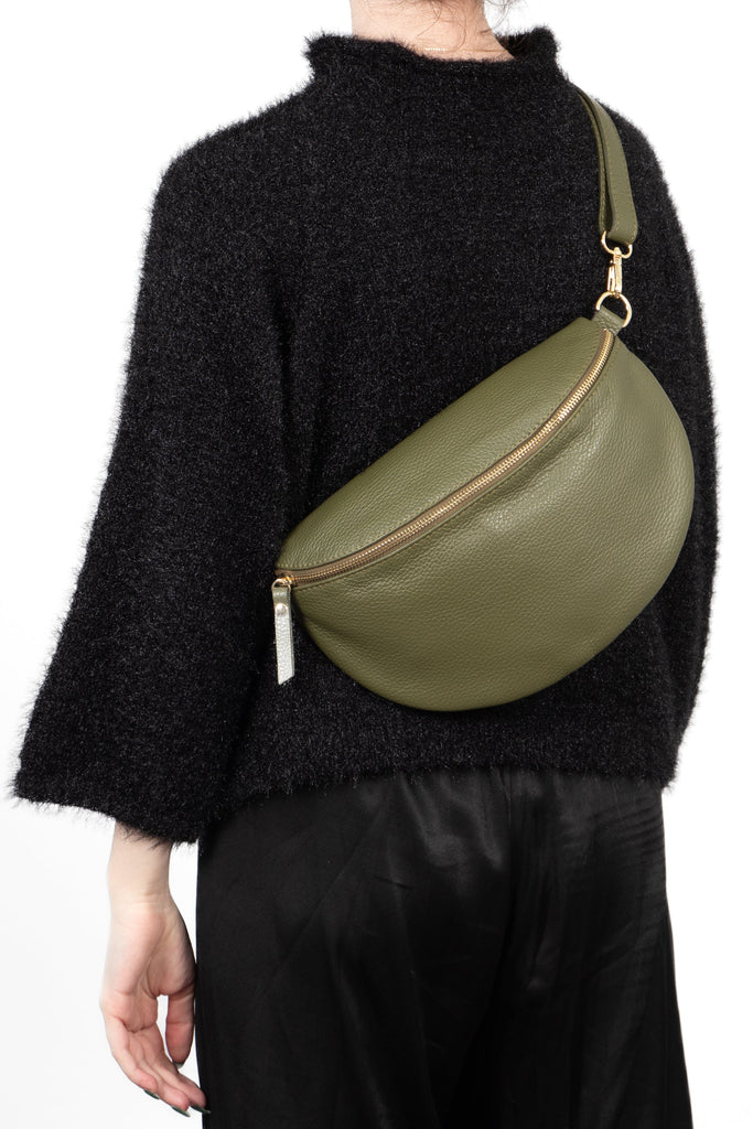 This large khaki green half-moon crossbody bag is crafted from genuine Italian leather. Featuring a lined interior, zip closure and classic gold hardware. This luxurious bag includes a removable adjustable strap allowing it to be worn over the shoulder or carried cross body.