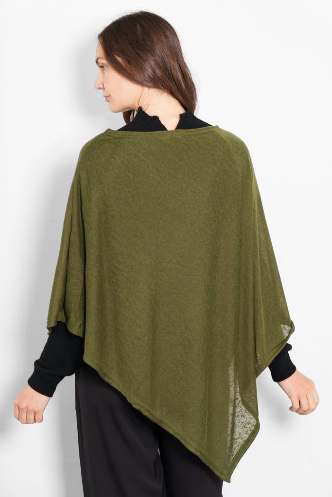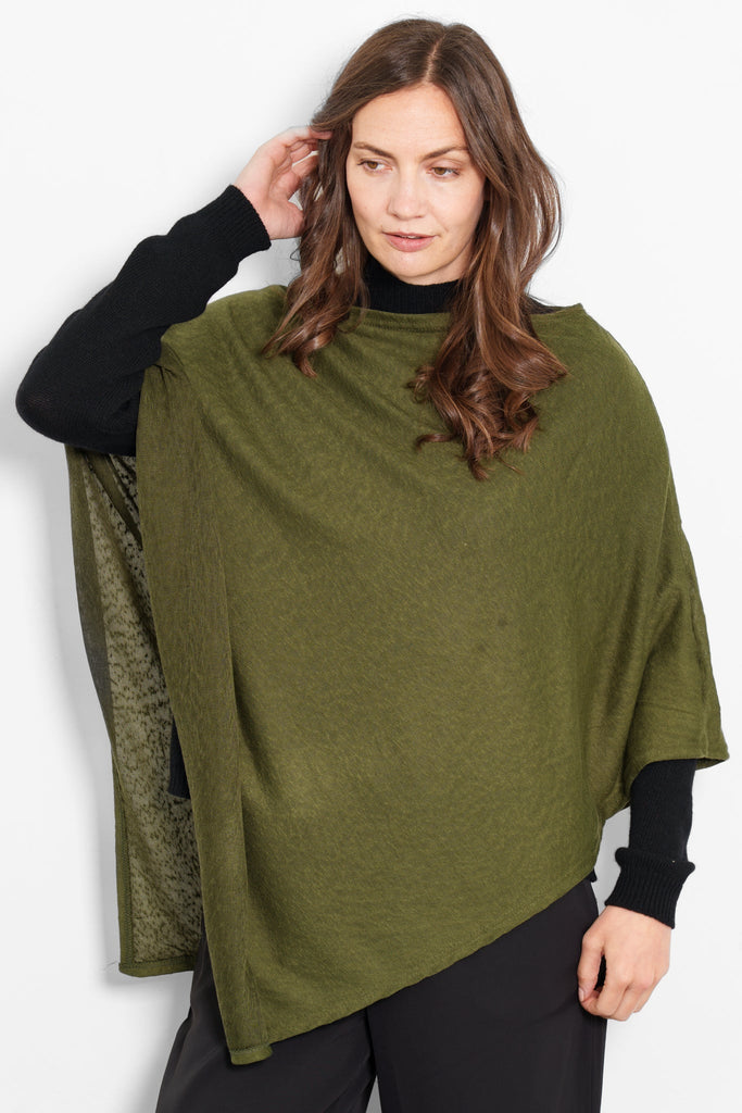 A classic khaki green poncho crafted from soft lightweight viscose. Featuring a flattering asymmetrical hem, wide short sleeves, and a high neck. This relaxed pullover poncho is an ideal piece for seasonal layering.