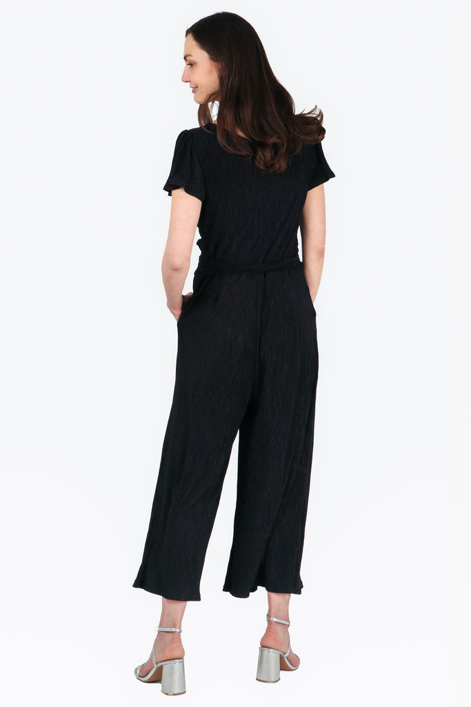 Wide Leg V-Neck Jumpsuit - Black, Plisse
