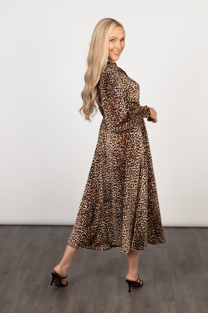 A classic neutral leopard print midaxi dress crafted from soft viscose. Showcasing a cinched shirred waist, full sleeve and grandad collar V-neck. This dress is designed for versatility and can be worn day or night.