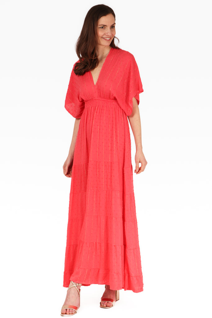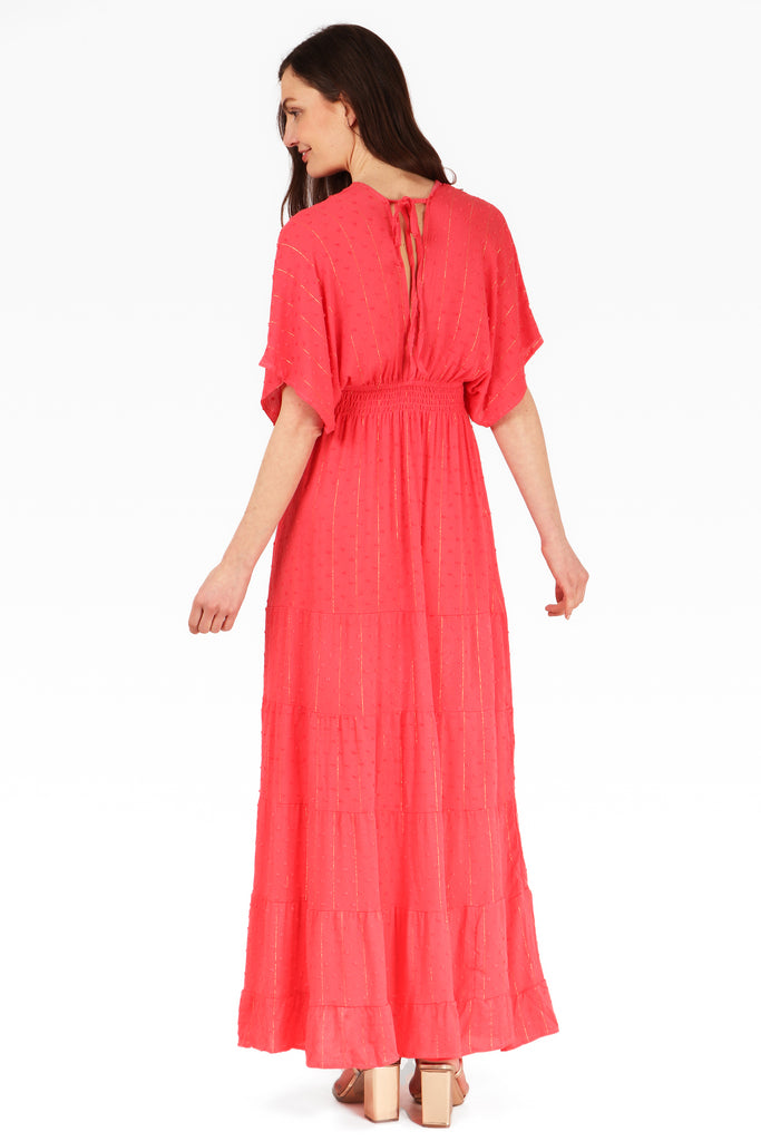 Gold Metallic Stripe Dobby Maxi Kaftan Dress in Coral