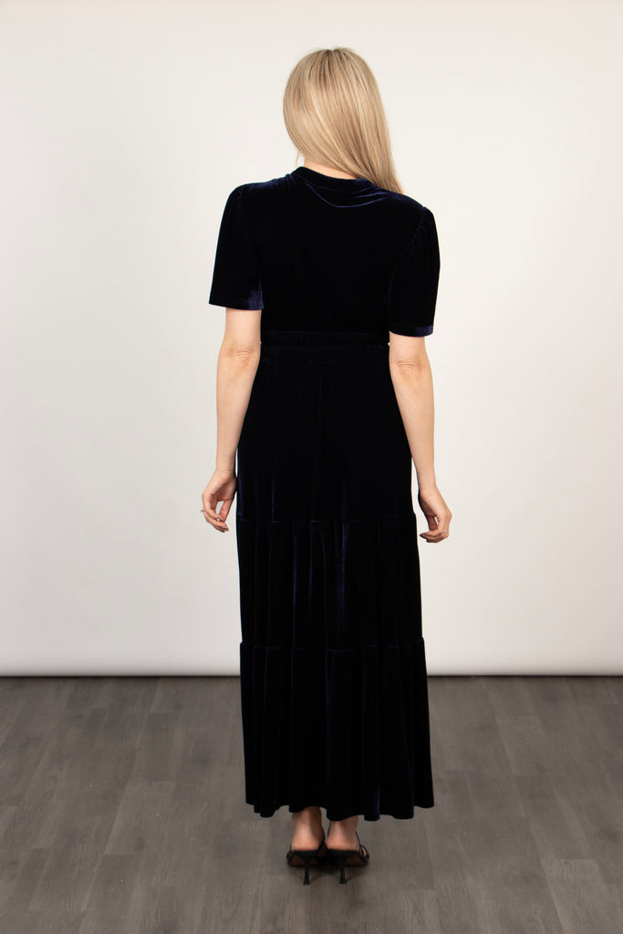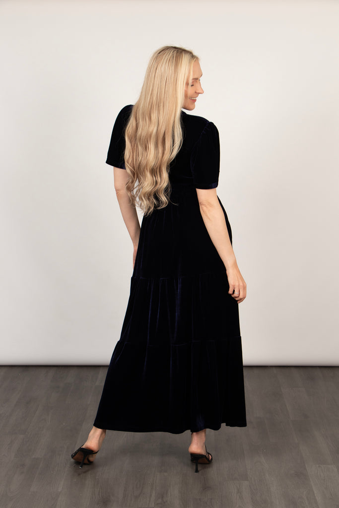 This classic maxi dress is crafted from a soft flowing velvet fabric. Showcasing a deep navy blue hue, short sleeves, subtle V-neck and a cinched elasticated waist. This tiered maxi dress is a perfect occasion piece designed to create a flattering silhouette.