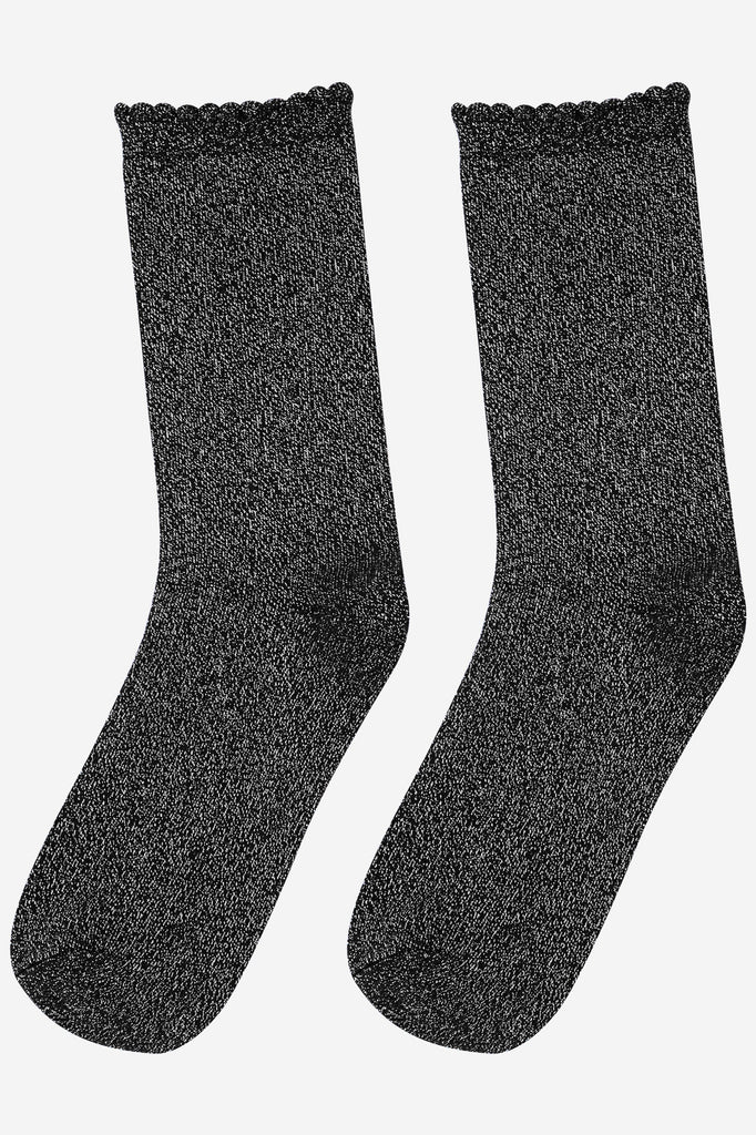 Designed in the UK, these glitter socks are crafted from soft blended cotton. Classic black socks with an eye-catching bold silver sparkle. Naturally breathable with a luxuriously comfortable scalloped cuff.
