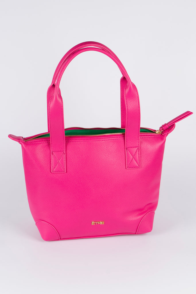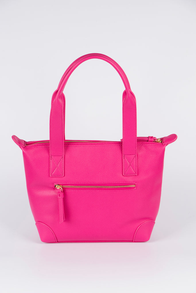 This vibrant fuchsia pink tote bag is crafted from soft pebbled faux leather. Featuring a spacious fully lined main compartment, inner phone pocket, zip closure and classic gold hardware.