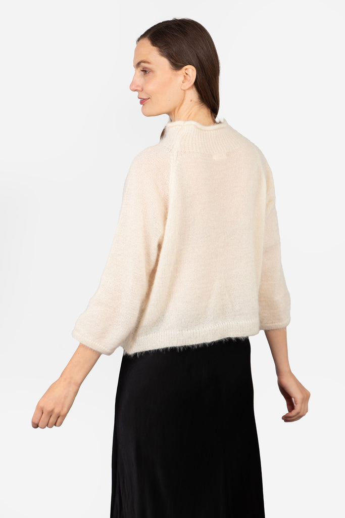 A classic cream box jumper crafted from a wool blend yard. Showcasing a mohair texture, high neck and cropped bell sleeves this winter jumper is designed to feel cosy.