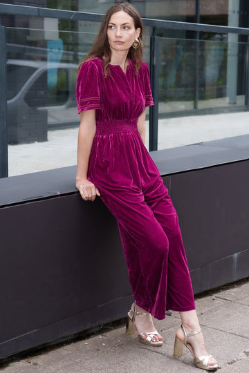 A chic jumpsuit crafted from soft velvet fabric. Showcasing a V-neck, shirred waist and short sleeves. This jumpsuit is a perfect occasion piece designed to create a flattering silhouette.