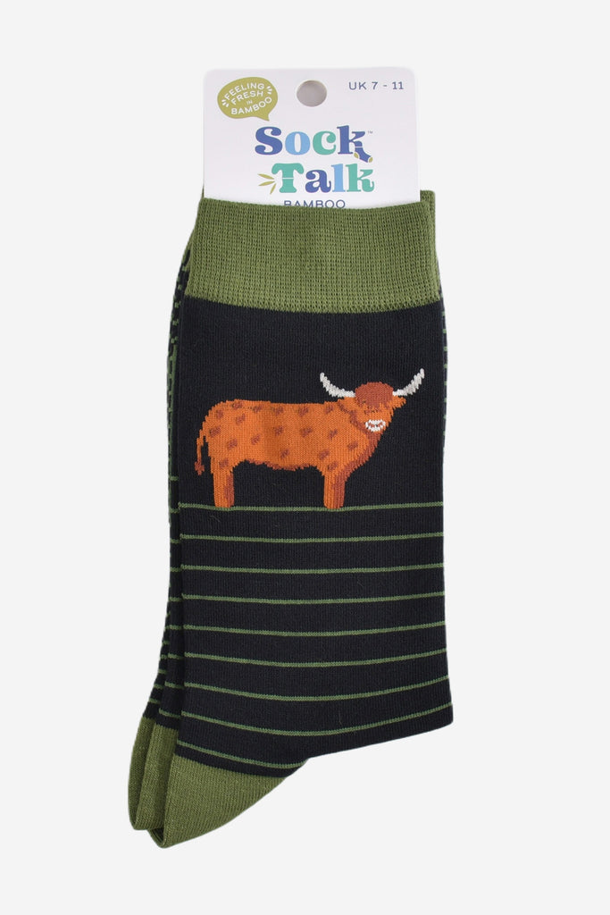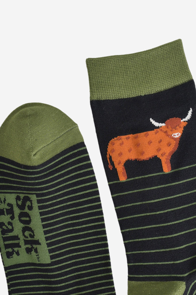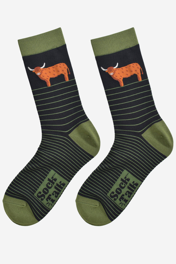 Men's Bamboo Socks - Black/Green, Highland Cow Stripe