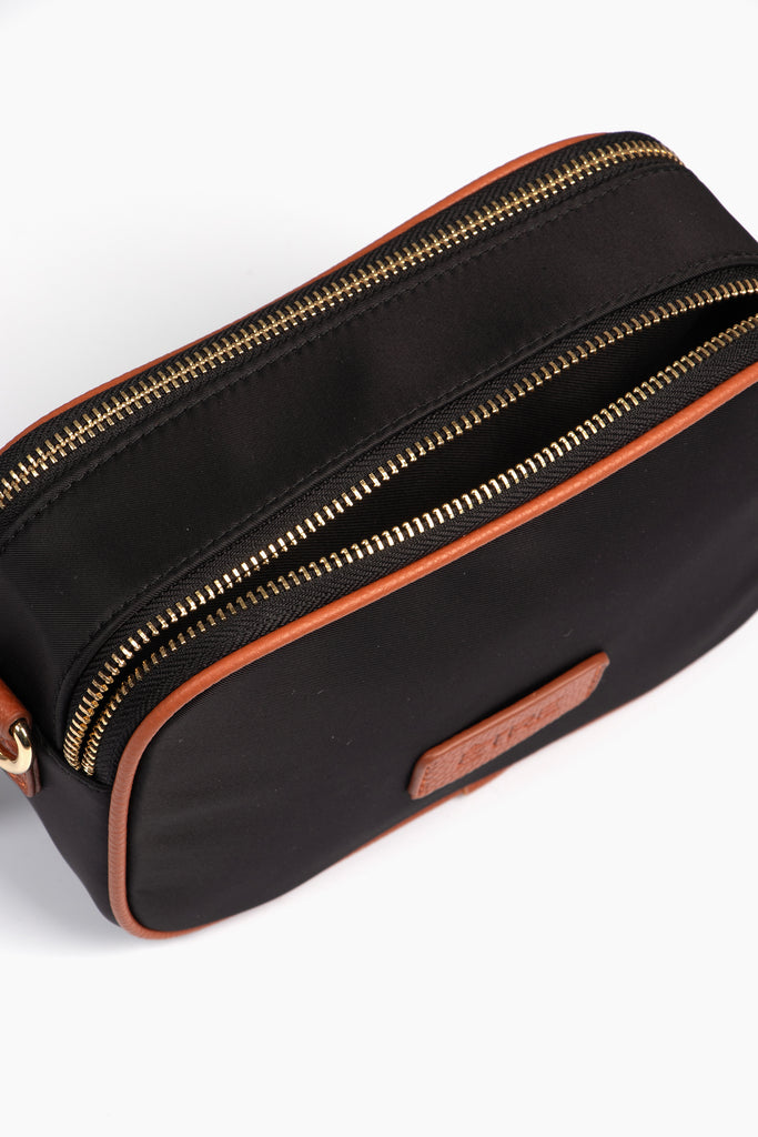 A classic crossbody bag, crafted from lightweight durable Nylon with PU faux leather accents. Featuring two internal pockets, external zip closure and classic gold hardware. This bag also includes an adjustable detachable bag strap, allowing it to be worn over the shoulder or carried cross body.