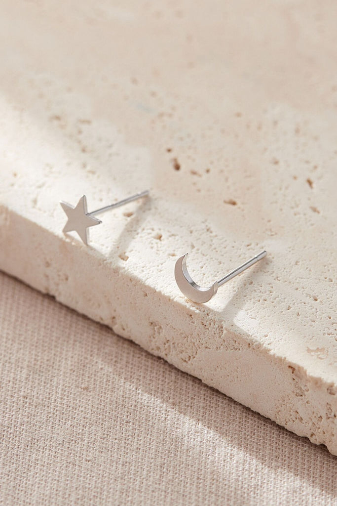 Sterling Silver Asymmetric Star & Moon Frosted Stud Earrings