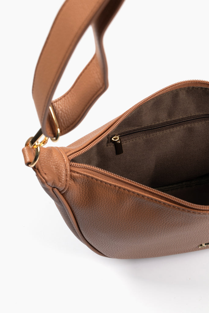 This tan crossbody sling bag is crafted from soft faux leather. Designed for everyday wear this half moon bag features an adjustable strap, zip closure and classic gold hardware.
