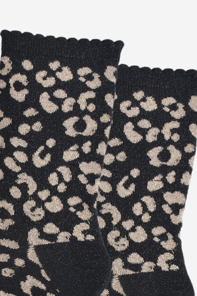 Designed in the UK, these glitter socks are crafted from soft blended cotton. Classic black socks with a gold leopard print pattern and eye catching sparkle. Naturally breathable with a luxuriously comfortable scalloped cuff.